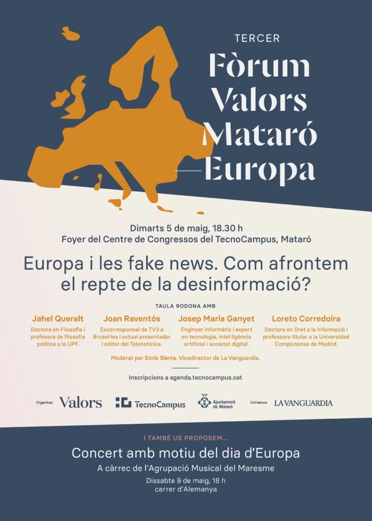S’acosta el Dia d’Europa i des de Valors, per tercera vegada, organitzem juntament amb TecnoCampus i l’Ajuntament, el Fòrum Valors Mataró-Europa. Aquest any sota el títol ‘Europa i les fake news: com combatre el repte la desinformació?’. Serà el proper dimarts dia 5 de maig a 2/4 de 7 de la tarda al foyer del parc tecnològic de Mataró.